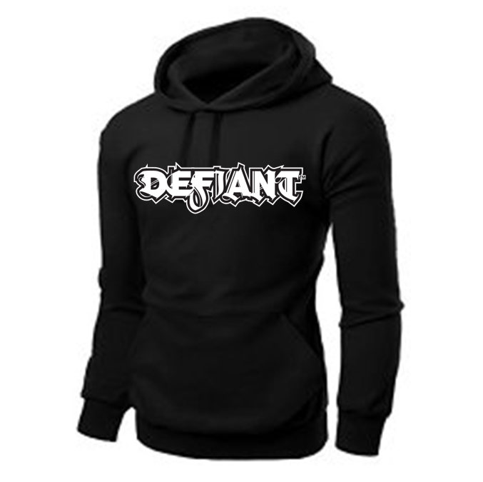 Defiant Old English text chest print logo. Back print highlights silhouettes of multiple fighters and swordsman engaged in combat. Hope is not a strategy … Defiant by design!